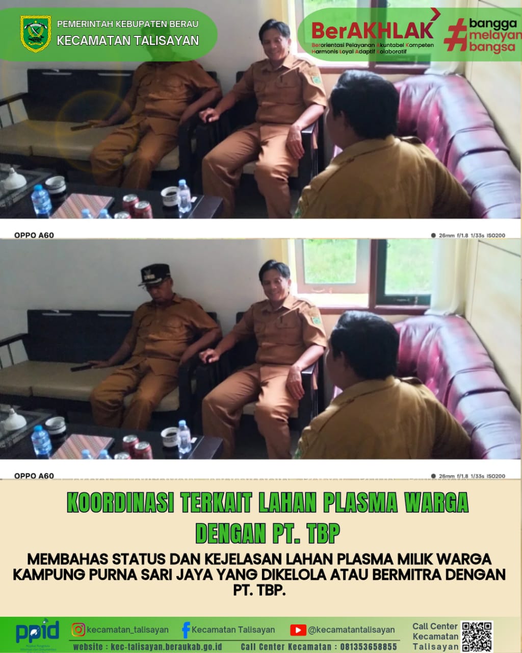 Posted by Hari Wibowo KOORDINASI TERKAIT LAHAN PLASMA WARGA DENGAN PT. TBP 2025-09-30 14:58:10 Pemerintahan 0 TALISAYAN, 29 SEPTEMBER 2025 KOORDINASI TERKAIT LAHAN... Continue Reading