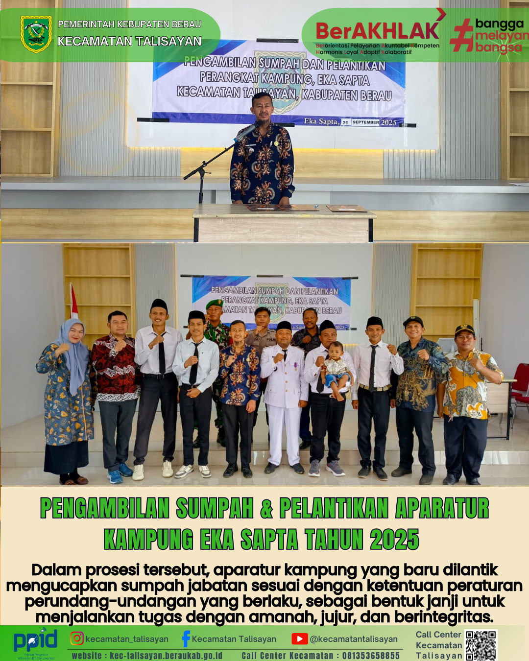 Posted by Hari Wibowo PENGAMBILAN SUMPAH DAN PELANTIKAN APARATUR KAMPUNG EKA SAPTA TAHUN 2025 2025-09-28 21:07:26 Pemerintahan 0 TALISAYAN, 25 SEPTEMBER 2025 PENGAMBILAN SUMPAH DAN... Continue Reading