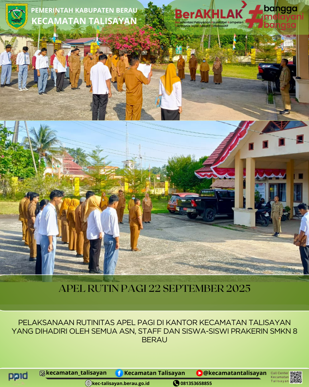 Posted by Hari Wibowo APEL RUTIN PAGI DILINGKUNGAN PEMERINTAH KECAMATAN TALISAYAN 2025-09-23 10:44:49 KEGIATAN 0 TALISAYAN, 22 SEPTEMBER 2025 APEL RUTIN PAGI... Continue Reading